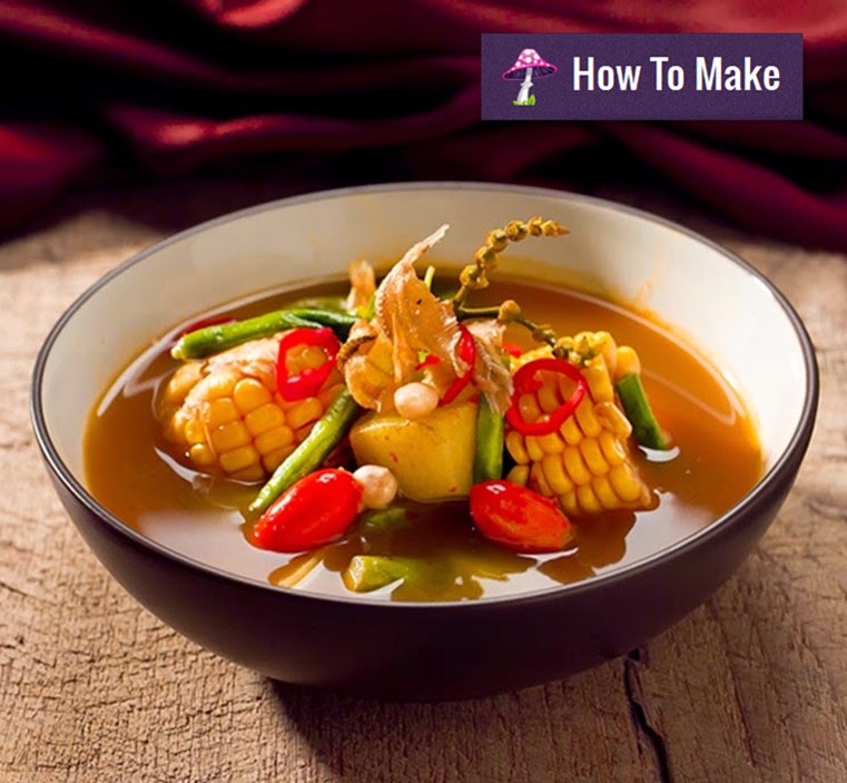 - Boil water along with spices, bay leaves, galangal and tamarind fruit. after input boiling corn, fruit melinjo. Stir and let over medium heat until tender.